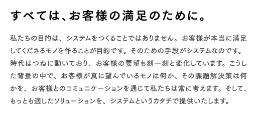 私たちの目的は、システムをつくることではありません。お客様が本当に満足してくださるモノを作ることが目的です。そのための手段がシステムなのです。